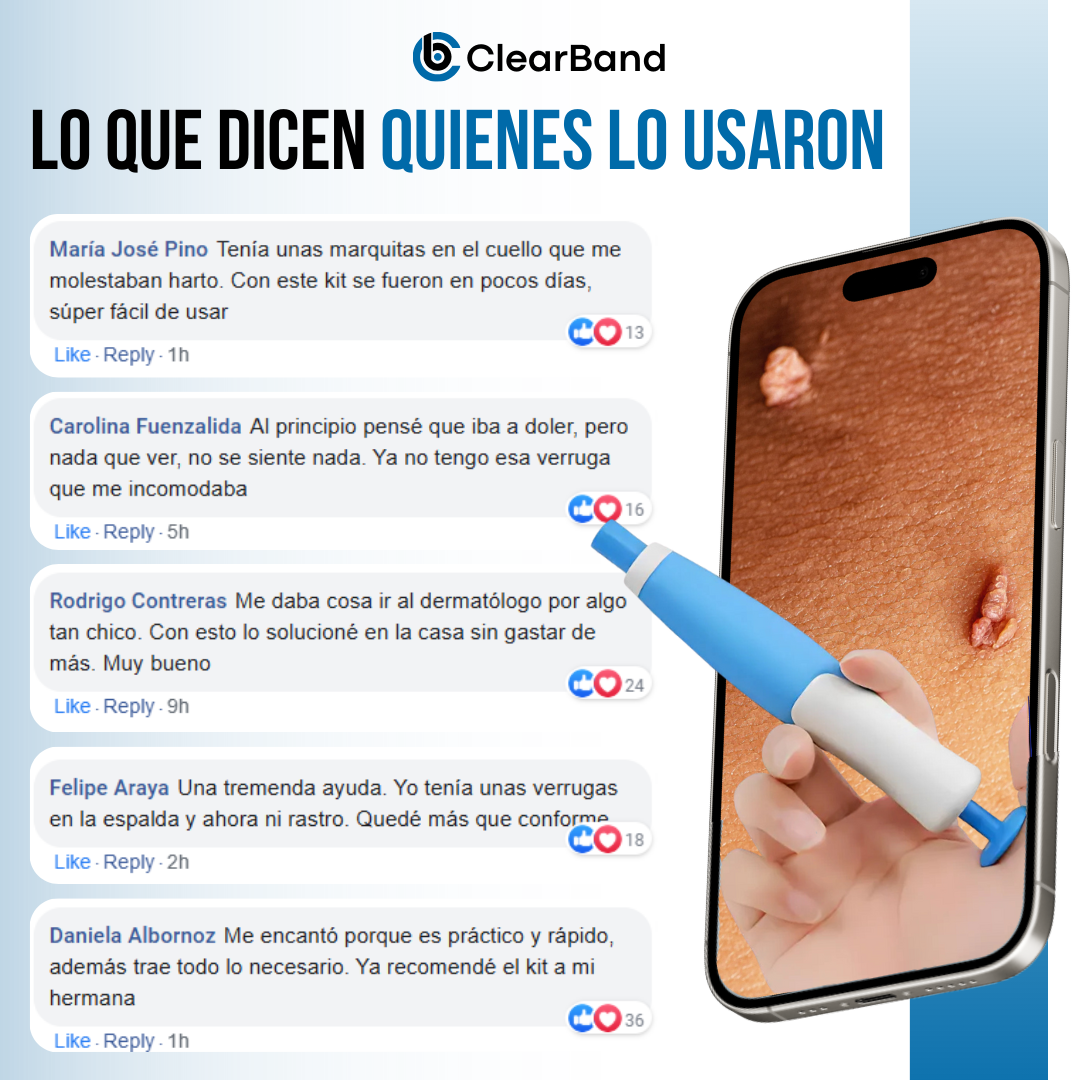 ClearBand™ está diseñado para ser completamente seguro e indoloro, utilizando un método de ligadura con pequeñas bandas de goma que reduce el suministro de sangre a la piel, permitiendo que las marcas desaparezcan de forma natural. No tendrás que preocuparte por quemaduras, alergias, picazón o dolor, ya que este principio físico trabaja suavemente sobre la piel, ofreciendo resultados visibles sin necesidad de costosos tratamientos dermatológicos o visitas médicas. Es ideal para quienes buscan una solución eficaz y segura en la comodidad de su hogar.