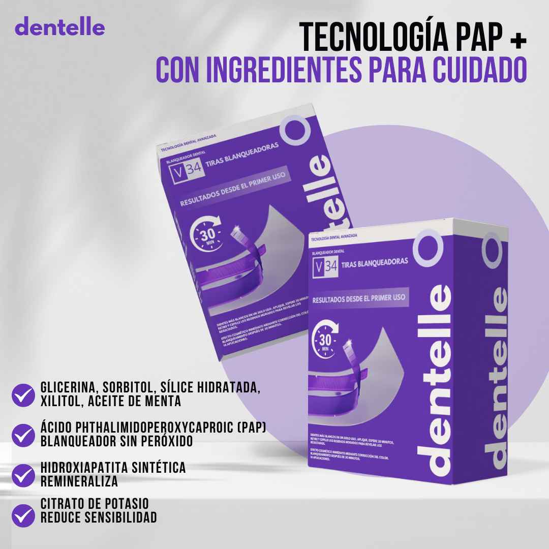 Las Dentelle™ utilizan una tecnología de doble acción: primero corrigen el color de los dientes de manera instantánea, mejorando visualmente tu sonrisa, y luego el blanqueamiento PAP+ actúa sobre las manchas superficiales para lograr resultados visibles tras 30 minutos.