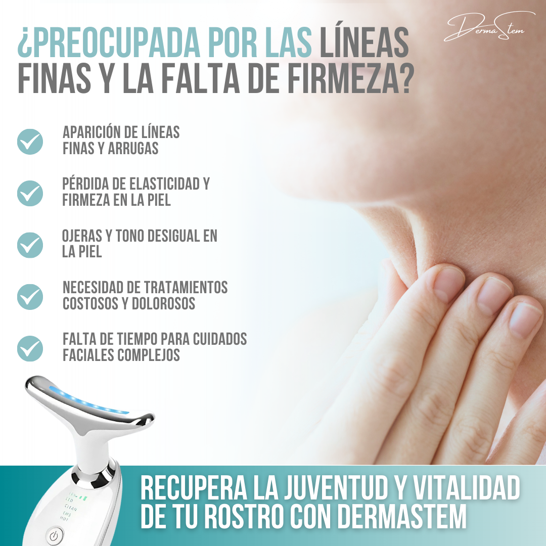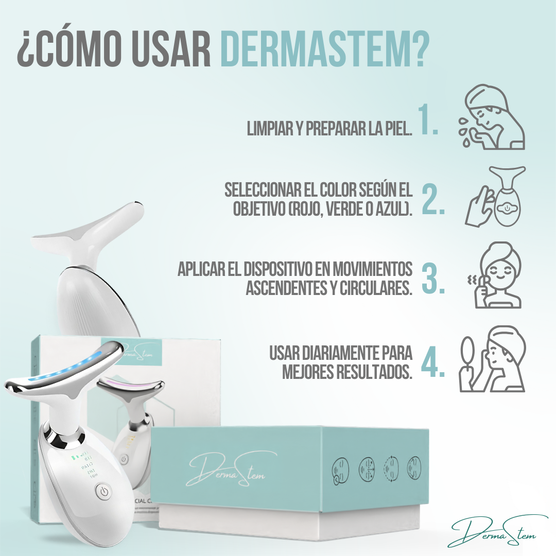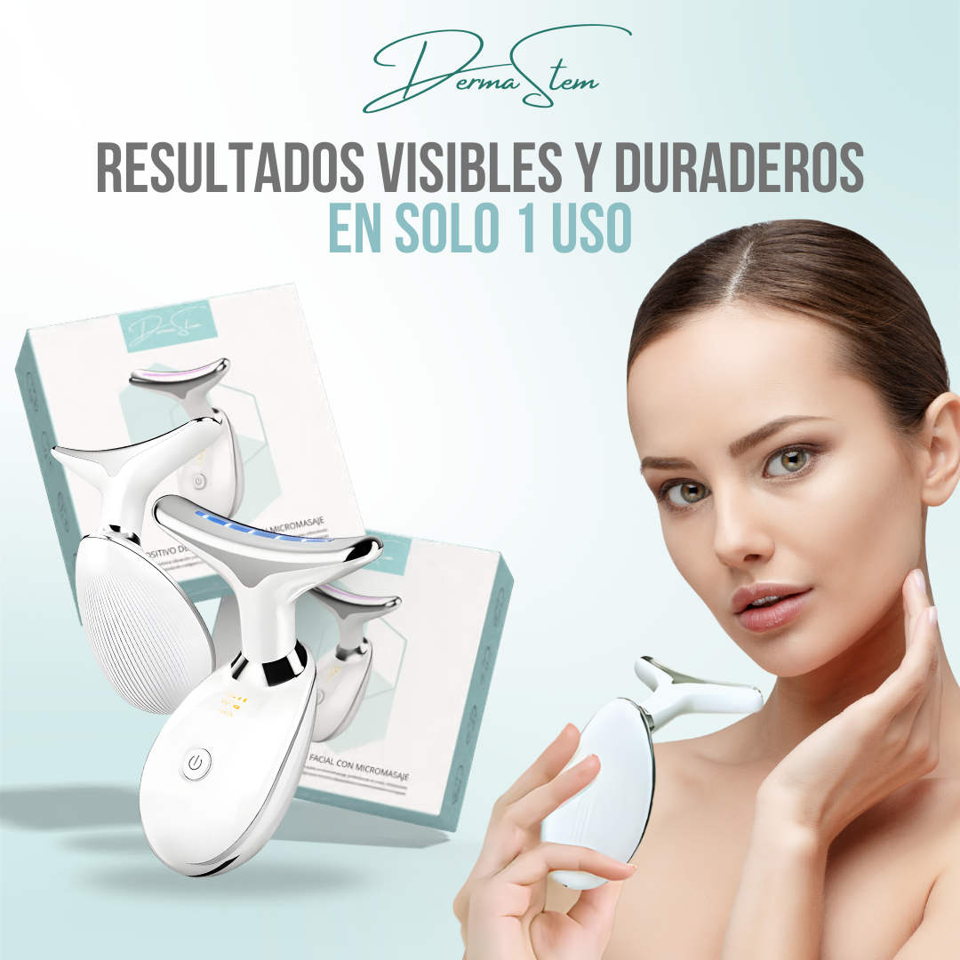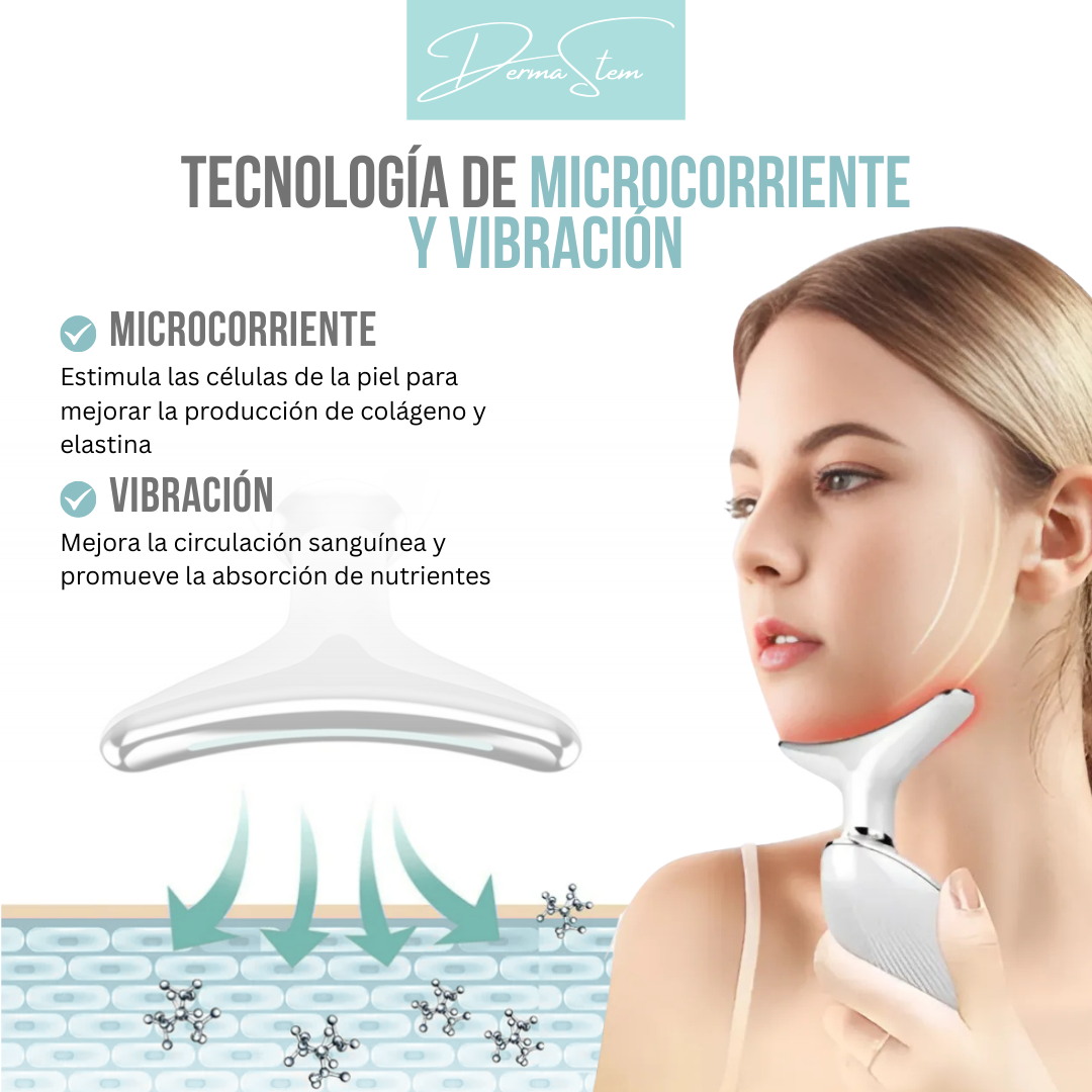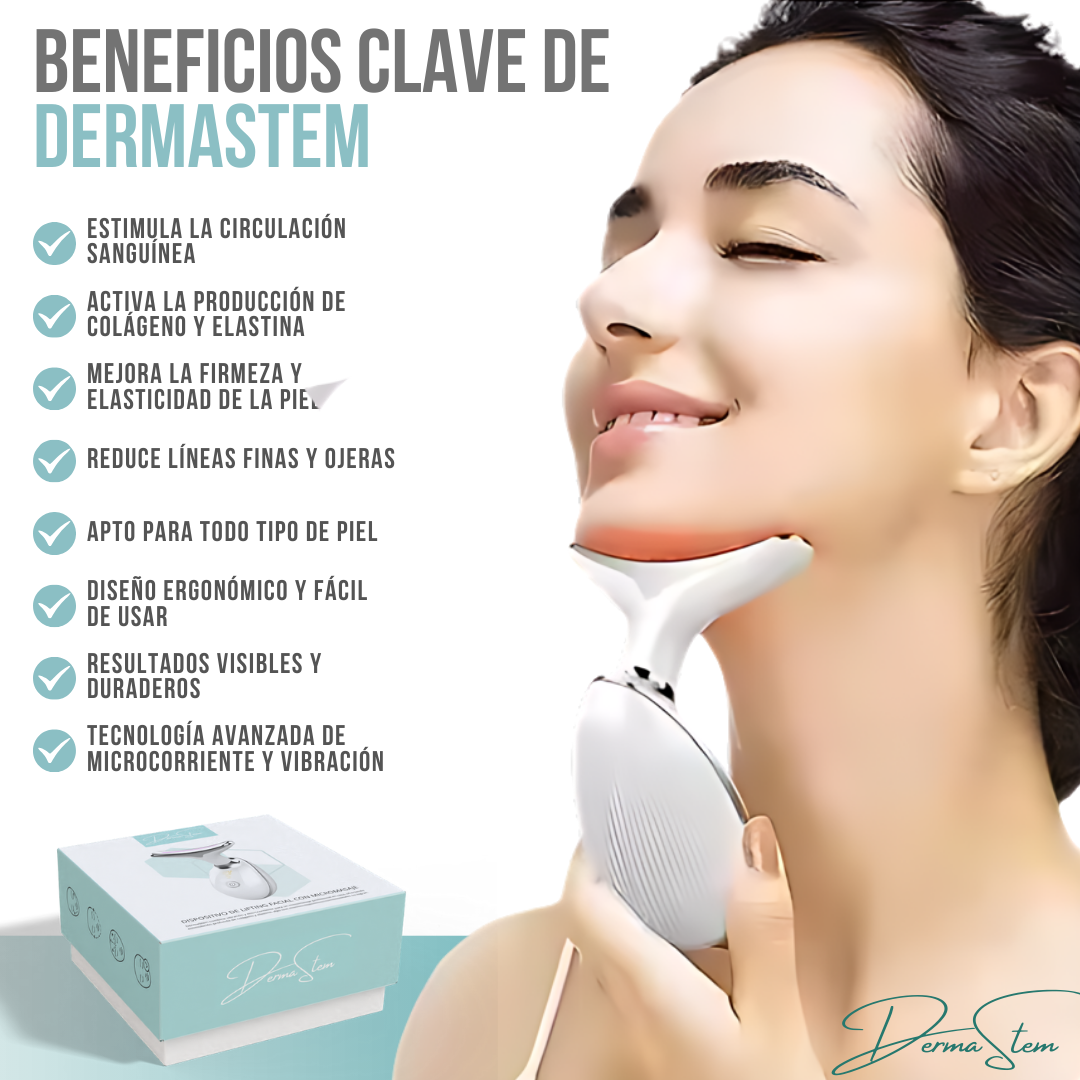 DermaStem™ utiliza tecnología de microcorriente y vibración para estimular la circulación sanguínea y activar la producción de colágeno y elastina, lo que mejora la firmeza y elasticidad de la piel y reduce las arrugas.
