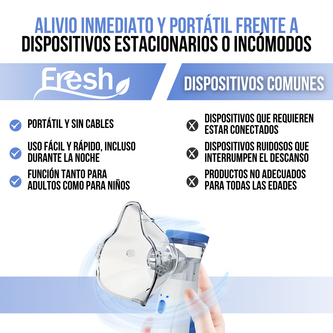 FRESH NEBULIZER™ está indicado para asma, bronquitis, resfríos, alergias y otras afecciones respiratorias que requieren tratamiento por inhalación. Su fina niebla ayuda a que el medicamento llegue directamente a las vías respiratorias.
