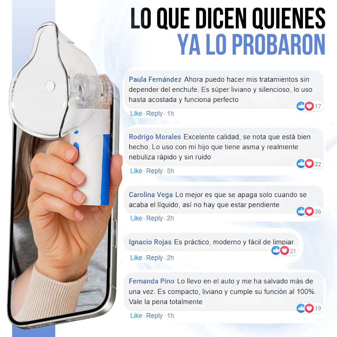 Otros usuarios valoran su portabilidad y la posibilidad de usarlo tanto con mascarilla como con boquilla. Recomendado por familias y profesionales, FRESH NEBULIZER™ se ha transformado en una solución confiable para quienes buscan un tratamiento respiratorio cómodo, eficaz y duradero.