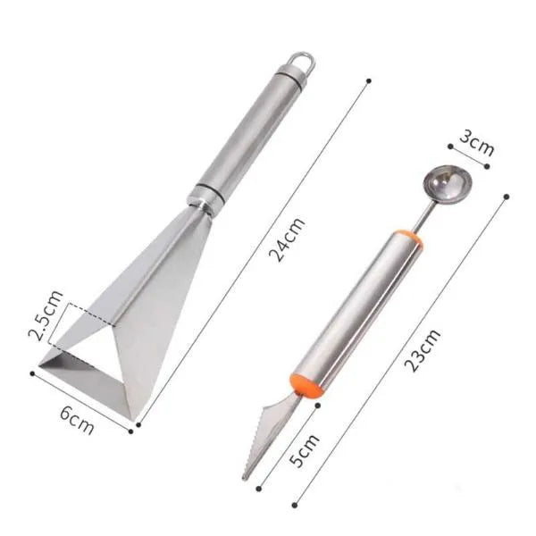 El conjunto incluye: un cuchillo de corte triangular (6 x 24 cm) y un cuchillo de corte de frutas 2 en 1 con cucharón (3 x 23 cm), garantizando la versatilidad y la eficiencia en cada uso.