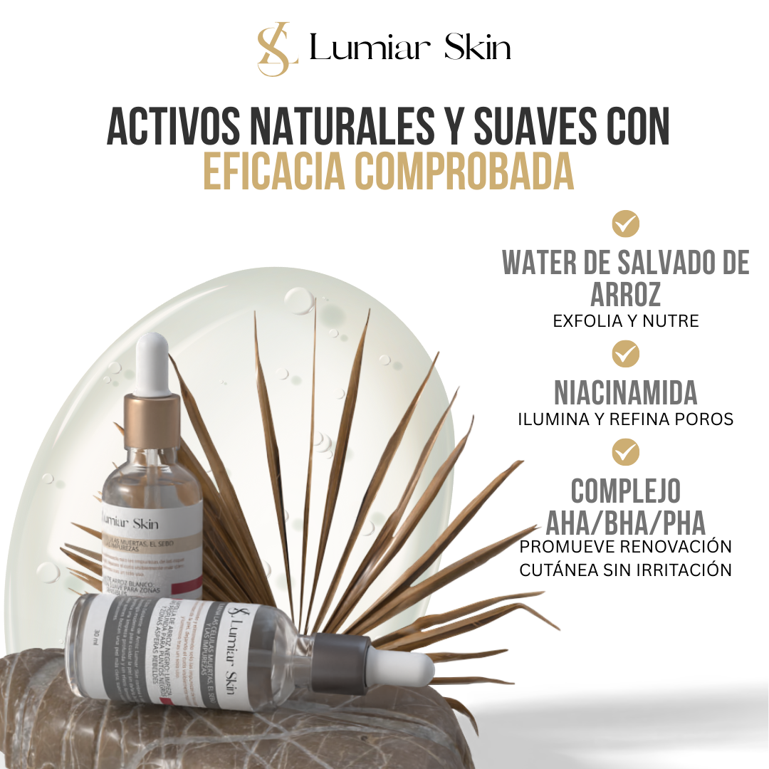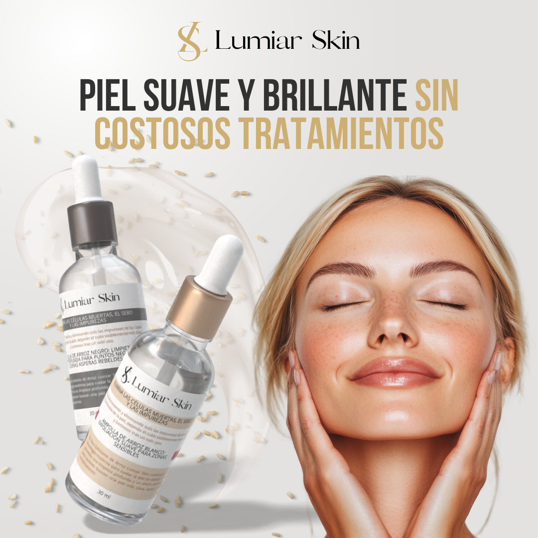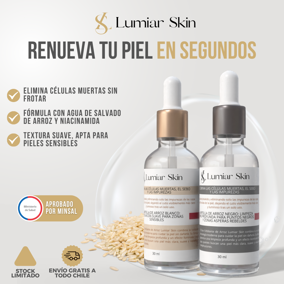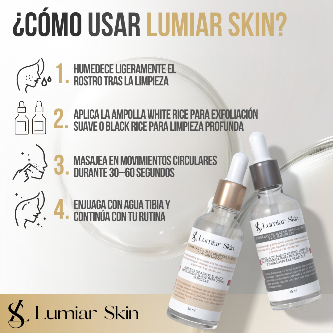 LUMIAR SKIN™ cuenta con un doble sistema que incluye la ampolla de arroz blanco, que realiza una exfoliación suave ideal para zonas sensibles, y la ampolla de arroz negro, que actúa en profundidad sobre zonas con puntos negros y asperezas, purificando los poros sin resecar la piel.