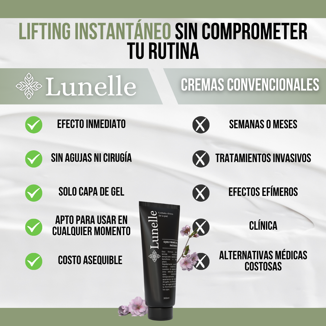 Lunelle™ es la solución perfecta para quienes buscan un levantamiento instantáneo y una mejora visible en el área de los ojos. Su fórmula avanzada actúa de forma rápida para tensar y reafirmar la piel, eliminando temporalmente la hinchazón y las arrugas finas.