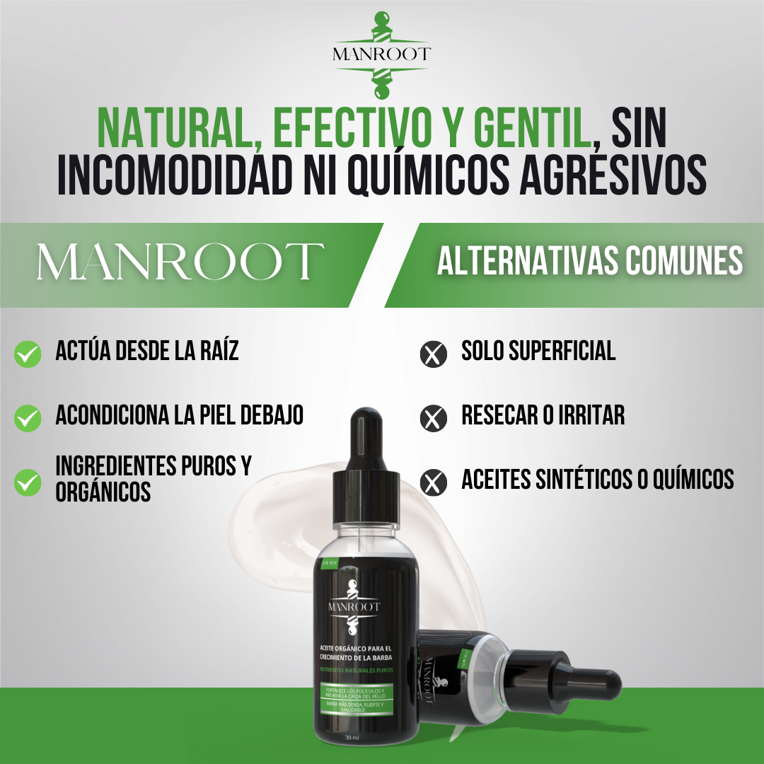 A diferencia de los tratamientos genéricos que a menudo son costosos, con fórmulas químicas agresivas, o complicados de usar, Manroot™ ofrece resultados rápidos con sus ingredientes 100 % naturales y orgánicos, que permiten un tratamiento seguro y cómodo en la privacidad de tu hogar.