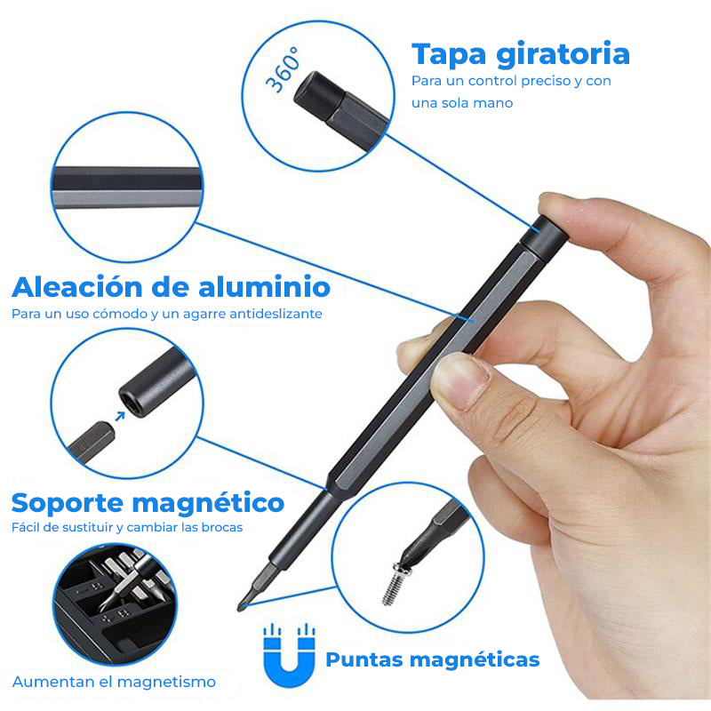 Este juego de destornilladores 24 en 1 es la herramienta definitiva para control preciso y versatilidad. Con su tapa giratoria y empuñadura de aleación de aluminio, garantiza un uso cómodo y un agarre antideslizante para trabajos precisos con una sola mano.