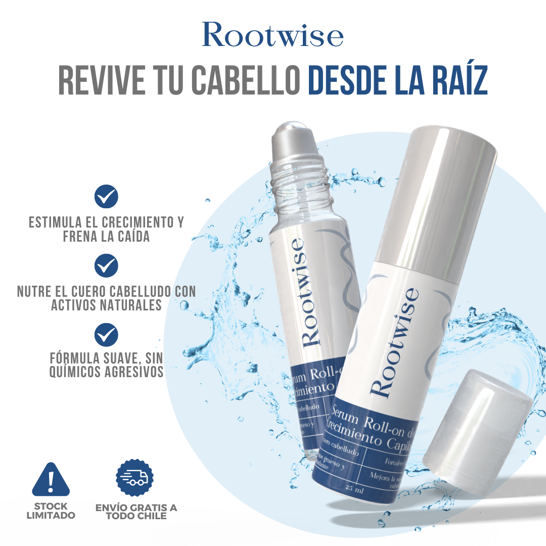 Rootwise™ es un sérum capilar potente y natural diseñado para devolverle vida a los cabellos debilitados y quebradizos. Con su combinación de extracto de romero e ingredientes botánicos, estimula el cuero cabelludo, fortalece los folículos y reduce la caída del cabello, logrando hebras más densas y abundantes. Su fórmula ligera y no grasa permite una absorción rápida, convirtiéndolo en un aliado perfecto para tu rutina diaria de cuidado capilar. Día tras día, notarás un cabello más fuerte, sano y lleno de vitalidad.
