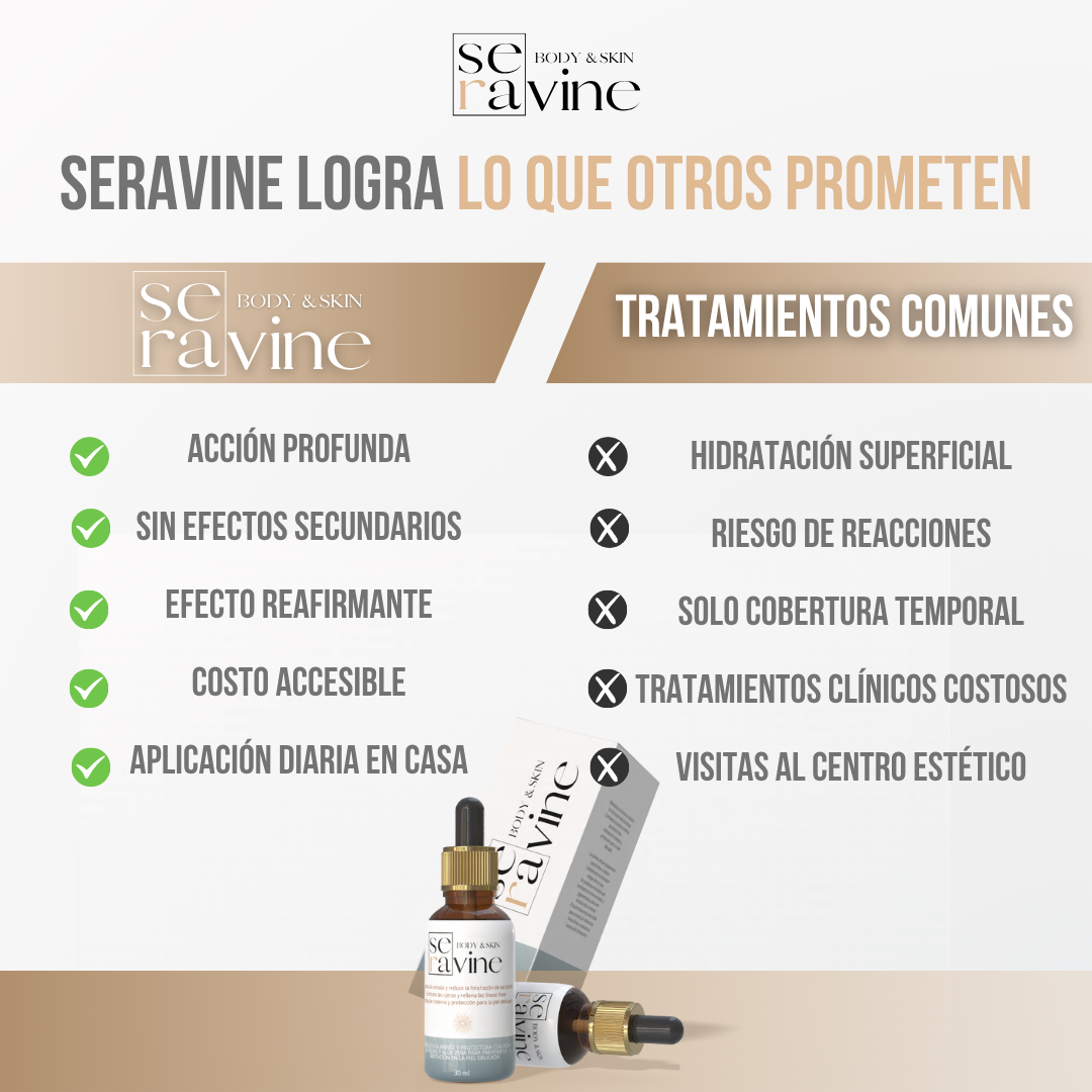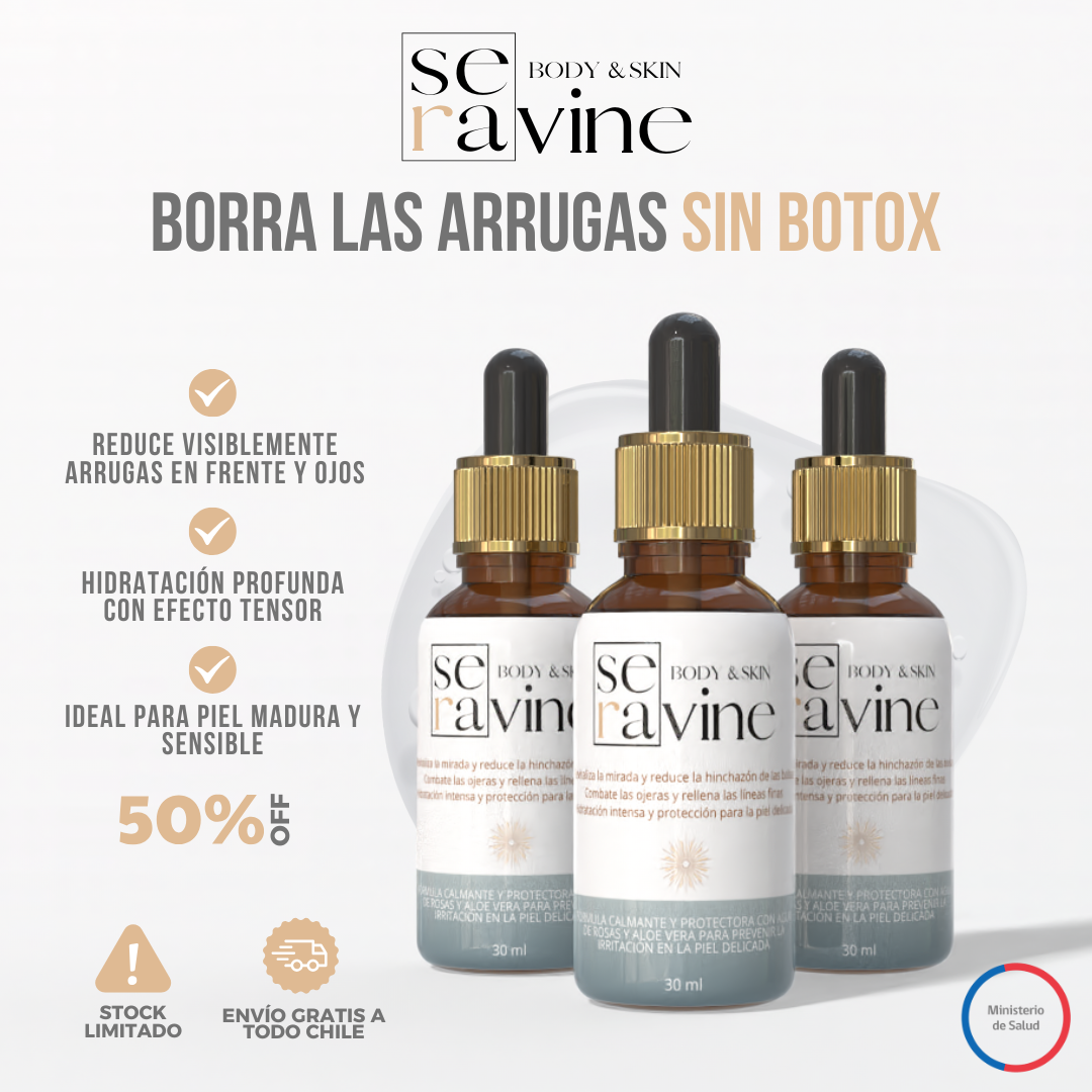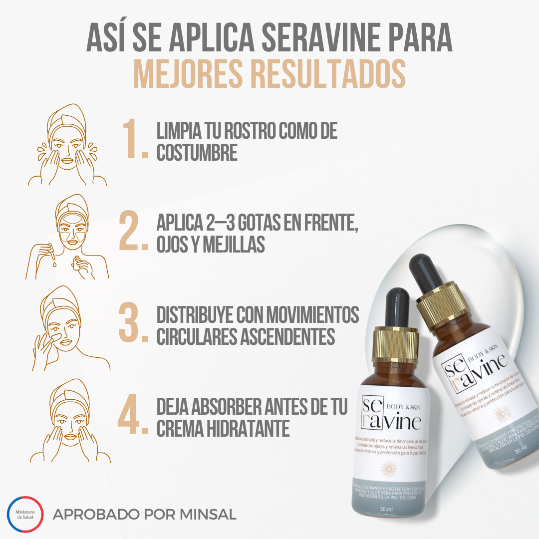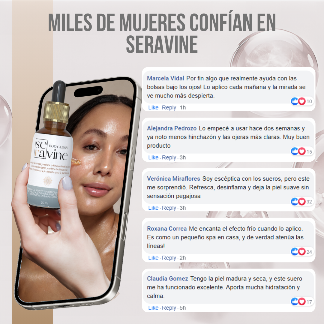 SERAVINE™ está diseñado para ser suave y seguro para la piel delicada alrededor de los ojos, gracias a ingredientes naturales como agua de rosas y aloe vera. No solo obtendrás resultados inmediatos, sino que con el uso constante, tu mirada se verá más joven, luminosa y descansada, mejorando con el tiempo la salud general de la piel en esa zona tan delicada.