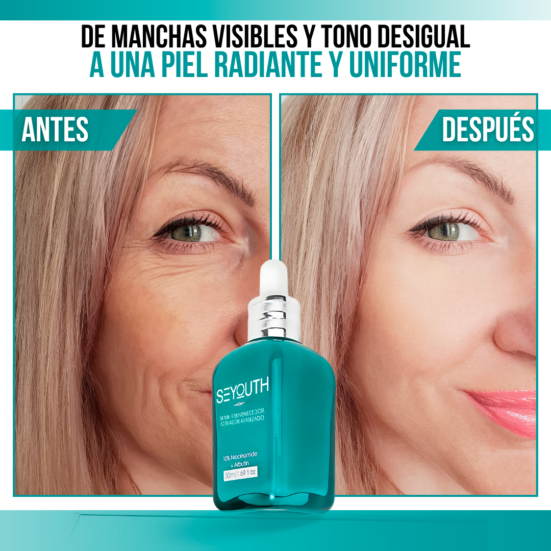 SEYOUTH™ está formulado para combatir eficazmente manchas oscuras, melasma y tono desigual. Gracias a su potente combinación de Niacinamida, Ácido Tranexámico y Extractos Botánicos, este serum estimula la renovación celular mientras duermes. Con el uso regular, notarás una piel más clara y uniforme, y verás cómo se atenúan las manchas con el paso del tiempo. Esta fórmula avanzada trabaja profundamente para restaurar la luminosidad y reducir las imperfecciones, ofreciendo resultados visibles cada mañana.