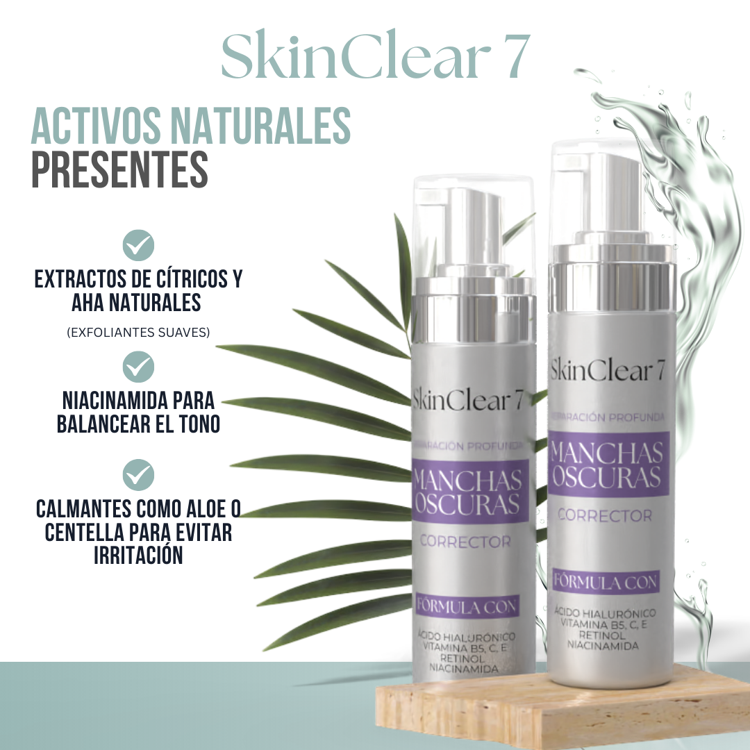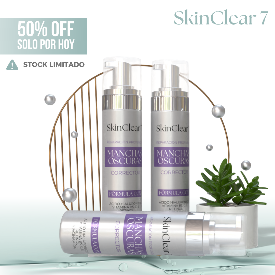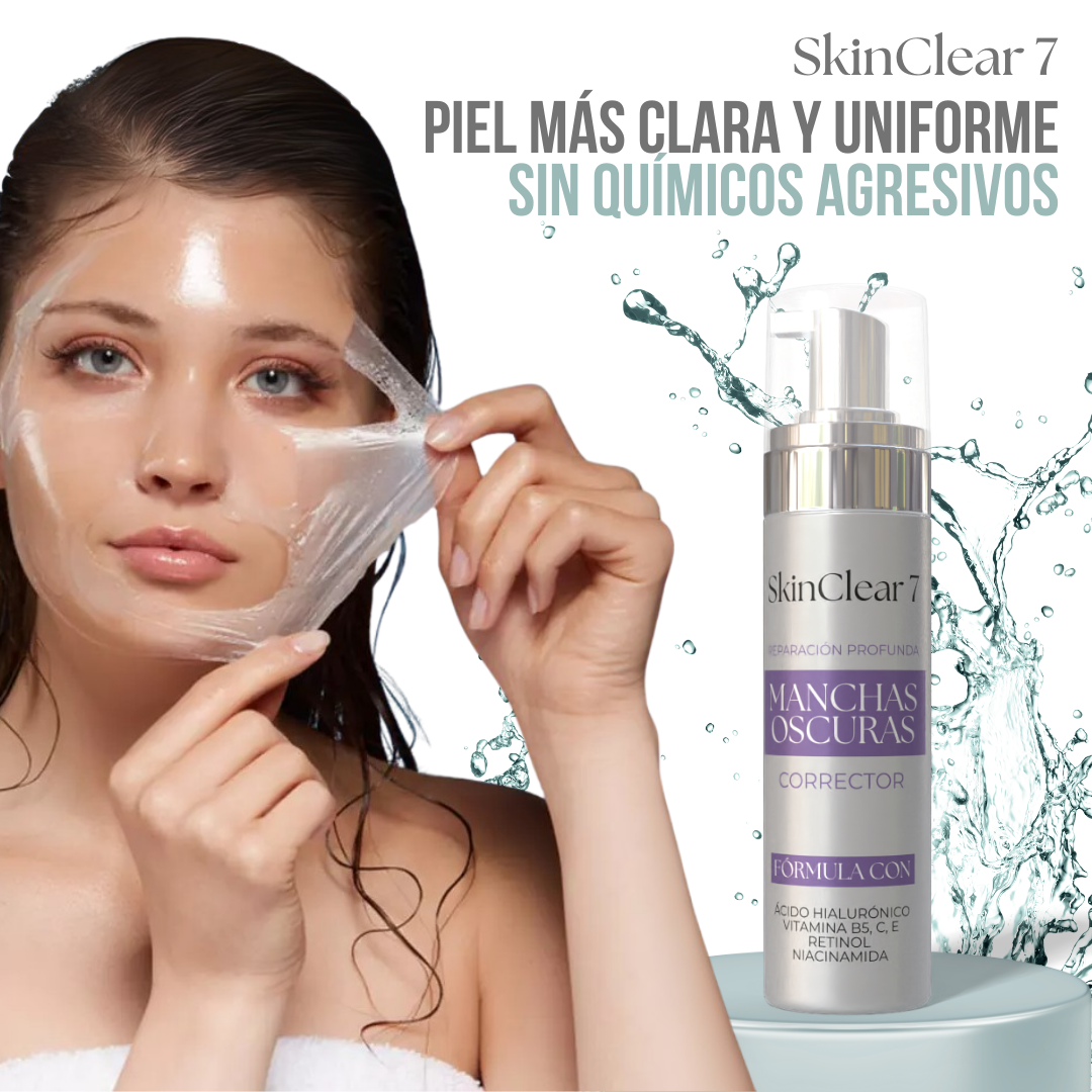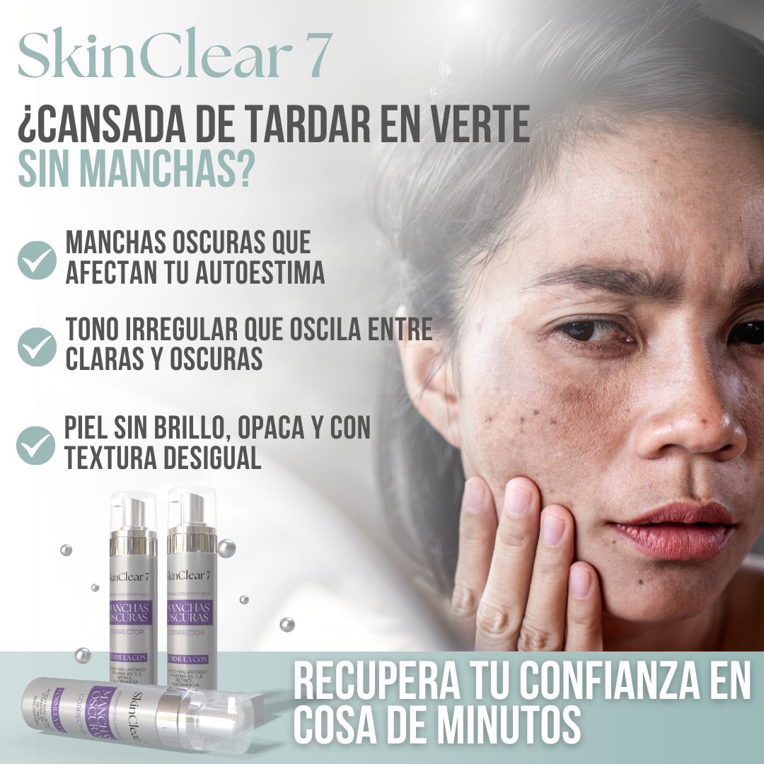 SkinClear7™ combina activos poderosos y poco comunes que atacan las manchas de pigmentación desde la raíz, logrando una piel más uniforme, brillante y saludable. Sus ingredientes como Vitamina C, Retinol, Niacinamida y Arbutina trabajan en sinergia para reducir manchas, hidratar y proteger la piel, incluso las más sensibles.