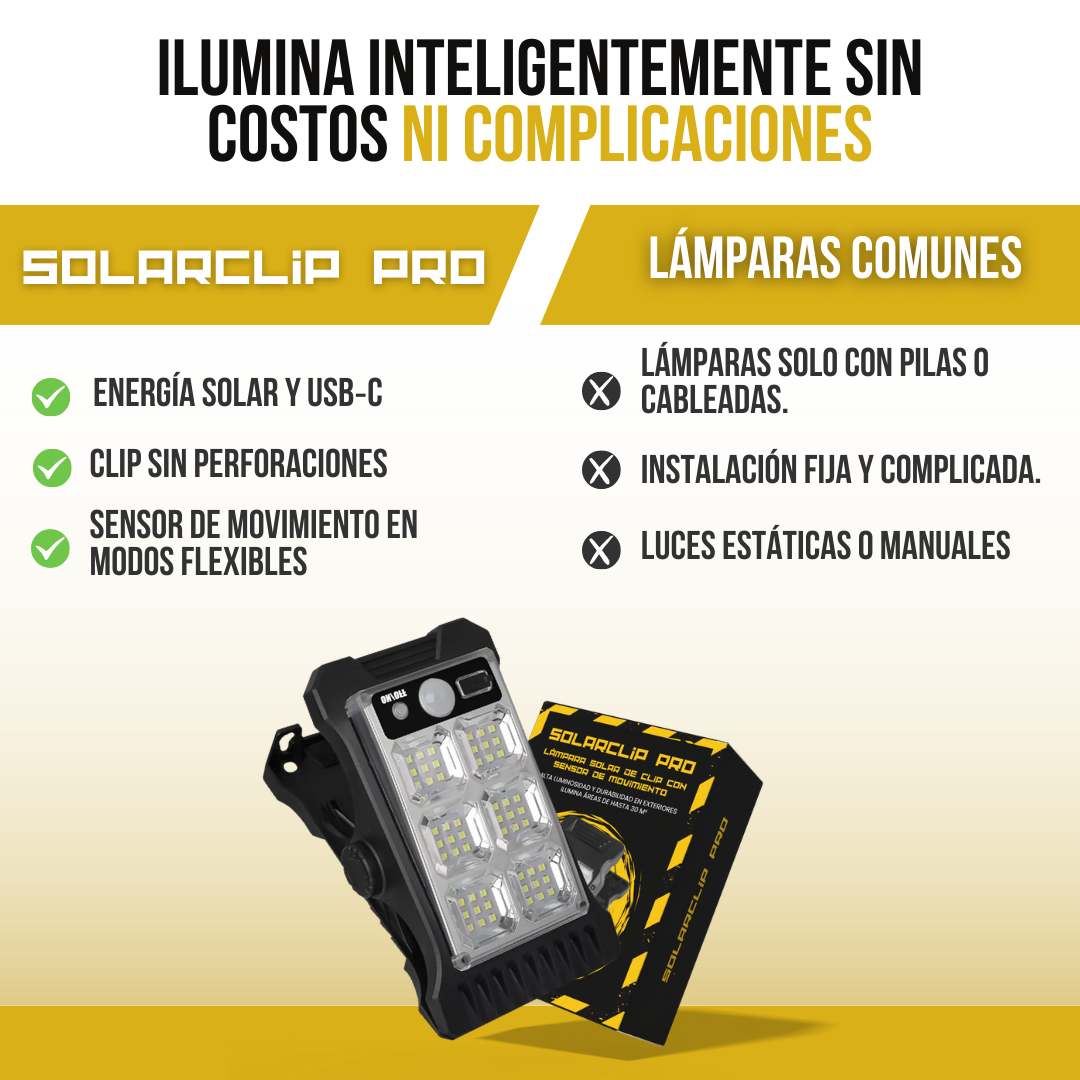 A diferencia de los sistemas de iluminación genéricos que a menudo son costosos, o difíciles de instalar y usar, SolarClip Pro™ ofrece resultados inmediatos. Con su tecnología de carga solar,permite un funcionamiento rápido, seguro y cómodo en cualquier lugar.