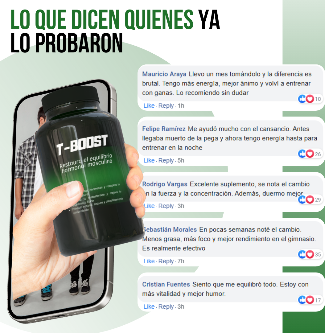 Sí, la fórmula de T-BOOST™ está compuesta por ingredientes clínicamente probados y naturales, sin esteroides ni hormonas artificiales. Está elaborada bajo estándares de calidad y seguridad, lo que garantiza un consumo confiable y sostenido.