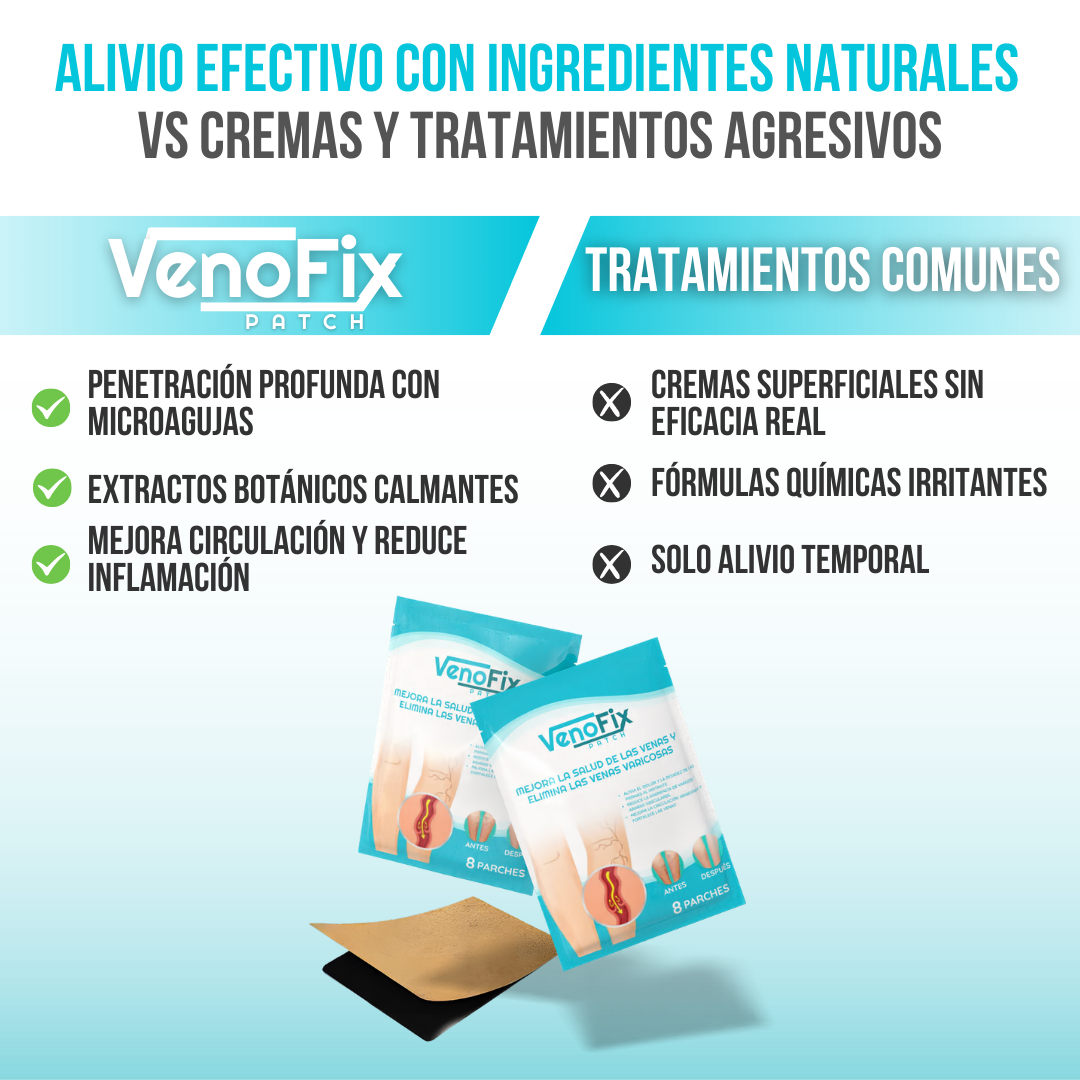 A diferencia de los tratamientos genéricos que a menudo son costosos, invasivos o difíciles de usar, VenoFix Patch™ ofrece resultados rápidos con su tecnología de extractos naturales, que permiten un tratamiento seguro y cómodo en la privacidad de tu hogar.