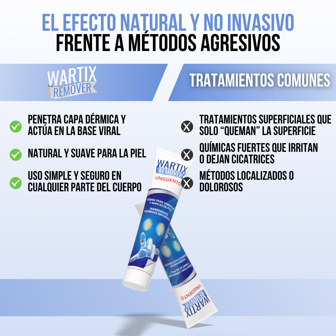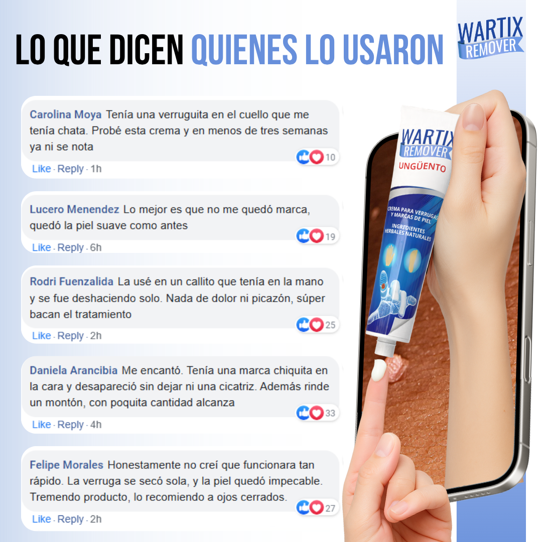 WARTIX REMOVER™ es un tratamiento avanzado que penetra profundamente en la verruga para descomponerla desde su interior y favorecer su eliminación natural. Formulada con ingredientes activos concentrados, esta crema actúa directamente sobre la verruga o marca cutánea, garantizando resultados visibles en pocas semanas sin dañar la piel circundante. Su fórmula ha sido desarrollada para ser eficaz en verrugas planas, lunares, callos y marcas superficiales, permitiéndote recuperar la textura y uniformidad de tu piel de manera segura y confiable.